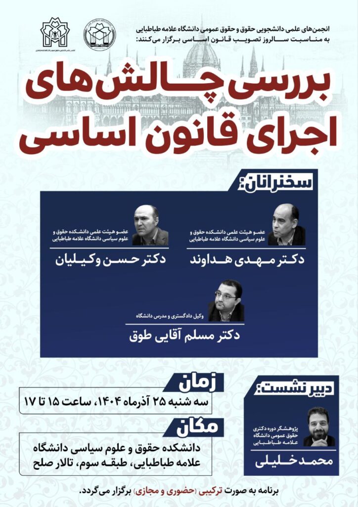 انجمنهای علمی – دانشجویی حقوق و حقوق عمومی دانشگاه علامه طباطبایی به مناسبت سالروز تصویب قانون اساسی نشست «بررسی چالشهای اجرای قانون اساسی» را برگزار میکنند. مهدی هداوند و حسن وکیلیان، اعضای هیئت علمی دانشکده حقوق و علوم سیاسی دانشگاه علامه طباطبائی و مسلم آقایی طوق، وکیل دادگستری و مدرس دانشگاه، در این نشست سخنرانی خواهند […]